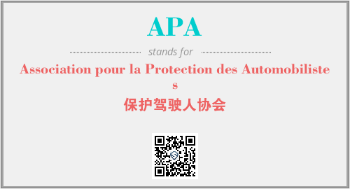 上述内容是“Association pour la Protection des Automobilistes”作为“APA”的缩写,解释为“保护驾驶人协会”时的信息,以及英文缩略词APA所代表的英文单词,其对应的中文拼音、详细解释以及在英文中的流行度和相关分类、应用领域及应用示例等。