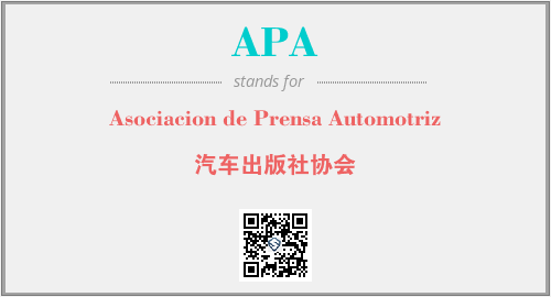 上述内容是“Asociacion de Prensa Automotriz”作为“APA”的缩写,解释为“汽车出版社协会”时的信息,以及英文缩略词APA所代表的英文单词,其对应的中文拼音、详细解释以及在英文中的流行度和相关分类、应用领域及应用示例等。