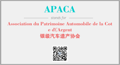 上述内容是“Association du Patrimoine Automobile de la Cote d\'Argent”作为“APACA”的缩写,解释为“银级汽车遗产协会”时的信息,以及英文缩略词APACA所代表的英文单词,其对应的中文拼音、详细解释以及在英文中的流行度和相关分类、应用领域及应用示例等。