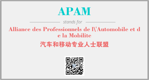 上述内容是“Alliance des Professionnels de l\'Automobile et de la Mobilite”作为“APAM”的缩写,解释为“汽车和移动专业人士联盟”时的信息,以及英文缩略词APAM所代表的英文单词,其对应的中文拼音、详细解释以及在英文中的流行度和相关分类、应用领域及应用示例等。