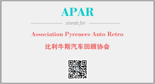 上述内容是“Association Pyrenees Auto Retro”作为“APAR”的缩写,解释为“比利牛斯汽车回顾协会”时的信息,以及英文缩略词APAR所代表的英文单词,其对应的中文拼音、详细解释以及在英文中的流行度和相关分类、应用领域及应用示例等。