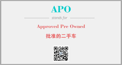英文缩略词“APO”经常作为“Approved Pre Owned”的英文缩写来使用,中文表示:“批准的二手车”。本文将详细介绍英文缩写词APO所代表英文单词,其对应的中文拼音、详细解释以及在英语中的流行度。此外,还有关于缩略词APO的分类、应用领域及相关应用示例等。