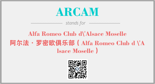 上述内容是“Alfa Romeo Club d\'Alsace Moselle”作为“ARCAM”的缩写,解释为“阿尔法·罗密欧俱乐部(Alfa Romeo Club d \'Alsace Moselle)”时的信息,以及英文缩略词ARCAM所代表的英文单词,其对应的中文拼音、详细解释以及在英文中的流行度和相关分类、应用领域及应用示例等。