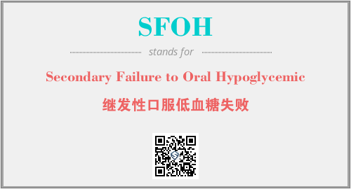 上述内容是“Secondary Failure to Oral Hypoglycemic”作为“SFOH”的缩写,解释为“继发性口服低血糖失败”时的信息,以及英文缩略词SFOH所代表的英文单词,其对应的中文拼音、详细解释以及在英文中的流行度和相关分类、应用领域及应用示例等。