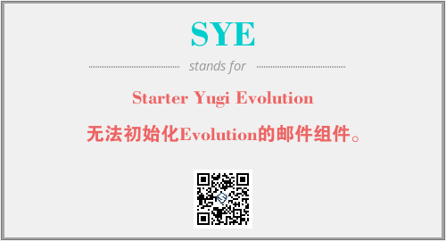上述内容是“Starter Yugi Evolution”作为“SYE”的缩写,解释为“无法初始化Evolution的邮件组件。”时的信息,以及英文缩略词SYE所代表的英文单词,其对应的中文拼音、详细解释以及在英文中的流行度和相关分类、应用领域及应用示例等。