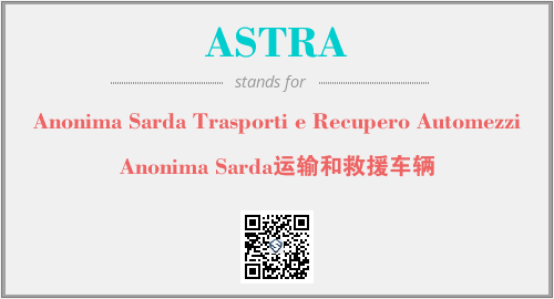 以上为Anonima Sarda Trasporti e Recupero Automezzi英文缩略词ASTRA的中文解释,以及该英文缩写在英语的流行度、分类和应用领域方面的信息。