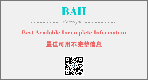 上述内容是“Best Available Incomplete Information”作为“BAII”的缩写,解释为“最佳可用不完整信息”时的信息,以及英文缩略词BAII所代表的英文单词,其对应的中文拼音、详细解释以及在英文中的流行度和相关分类、应用领域及应用示例等。
