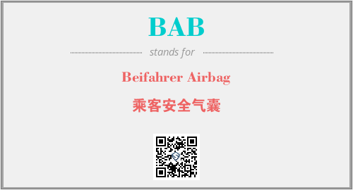 英文缩略词“BAB”经常作为“Beifahrer Airbag”的英文缩写来使用,中文表示:“乘客安全气囊”。本文将详细介绍英文缩写词BAB所代表英文单词,其对应的中文拼音、详细解释以及在英语中的流行度。此外,还有关于缩略词BAB的分类、应用领域及相关应用示例等。