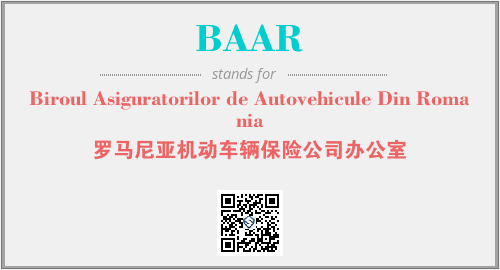 上述内容是“Biroul Asiguratorilor de Autovehicule Din Romania”作为“BAAR”的缩写,解释为“罗马尼亚机动车辆保险公司办公室”时的信息,以及英文缩略词BAAR所代表的英文单词,其对应的中文拼音、详细解释以及在英文中的流行度和相关分类、应用领域及应用示例等。