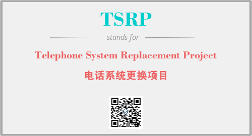 上述内容是“Telephone System Replacement Project”作为“TSRP”的缩写,解释为“电话系统更换项目”时的信息,以及英文缩略词TSRP所代表的英文单词,其对应的中文拼音、详细解释以及在英文中的流行度和相关分类、应用领域及应用示例等。