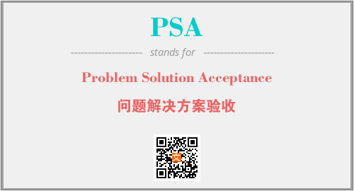 上述内容是“Problem Solution Acceptance”作为“PSA”的缩写,解释为“问题解决方案验收”时的信息,以及英文缩略词PSA所代表的英文单词,其对应的中文拼音、详细解释以及在英文中的流行度和相关分类、应用领域及应用示例等。