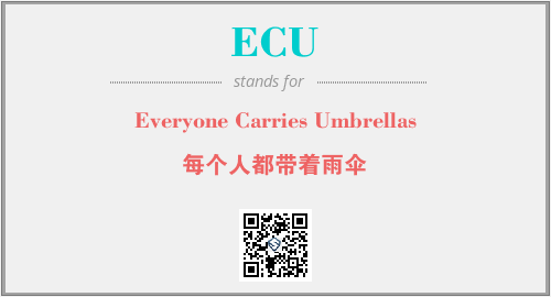 英文缩略词“ECU”经常作为“Everyone Carries Umbrellas”的英文缩写来使用,中文表示:“每个人都带着雨伞”。本文将详细介绍英文缩写词ECU所代表英文单词,其对应的中文拼音、详细解释以及在英语中的流行度。此外,还有关于缩略词ECU的分类、应用领域及相关应用示例等。