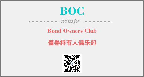 上述内容是“Bond Owners Club”作为“BOC”的缩写,解释为“债券持有人俱乐部”时的信息,以及英文缩略词BOC所代表的英文单词,其对应的中文拼音、详细解释以及在英文中的流行度和相关分类、应用领域及应用示例等。