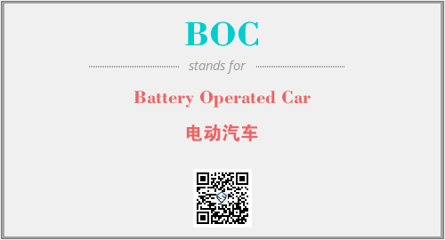 英文缩略词“BOC”经常作为“Battery Operated Car”的英文缩写来使用,中文表示:“电动汽车”。本文将详细介绍英文缩写词BOC所代表英文单词,其对应的中文拼音、详细解释以及在英语中的流行度。此外,还有关于缩略词BOC的分类、应用领域及相关应用示例等。