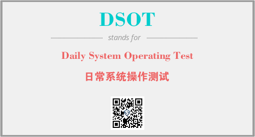 英文缩略词“DSOT”经常作为“Daily System Operating Test”的英文缩写来使用,中文表示:“日常系统操作测试”。本文将详细介绍英文缩写词DSOT所代表英文单词,其对应的中文拼音、详细解释以及在英语中的流行度。此外,还有关于缩略词DSOT的分类、应用领域及相关应用示例等。