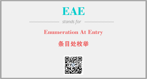上述内容是“Enumeration At Entry”作为“EAE”的缩写,解释为“条目处枚举”时的信息,以及英文缩略词EAE所代表的英文单词,其对应的中文拼音、详细解释以及在英文中的流行度和相关分类、应用领域及应用示例等。