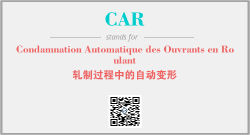 英文缩略词“CAR”经常作为“Condamnation Automatique des Ouvrants en Roulant”的英文缩写来使用,中文表示:“轧制过程中的自动变形”。本文将详细介绍英文缩写词CAR所代表英文单词,其对应的中文拼音、详细解释以及在英语中的流行度。此外,还有关于缩略词CAR的分类、应用领域及相关应用示例等。