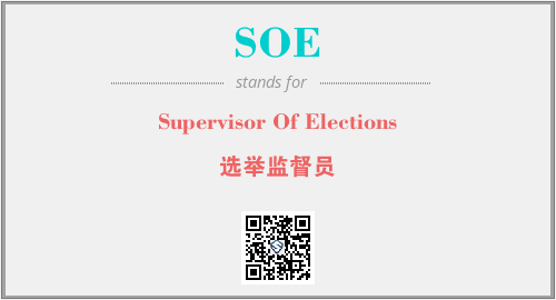 英文缩略词“SOE”经常作为“Supervisor Of Elections”的英文缩写来使用,中文表示:“选举监督员”。本文将详细介绍英文缩写词SOE所代表英文单词,其对应的中文拼音、详细解释以及在英语中的流行度。此外,还有关于缩略词SOE的分类、应用领域及相关应用示例等。