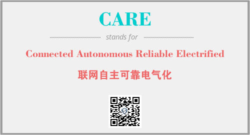 上述内容是“Connected Autonomous Reliable Electrified”作为“CARE”的缩写,解释为“联网自主可靠电气化”时的信息,以及英文缩略词CARE所代表的英文单词,其对应的中文拼音、详细解释以及在英文中的流行度和相关分类、应用领域及应用示例等。