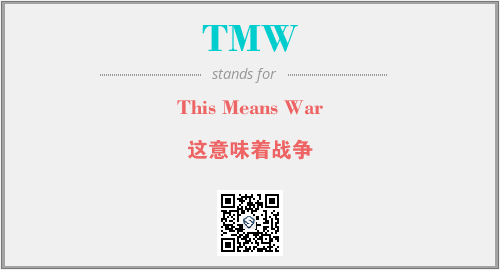 上述内容是“This Means War”作为“TMW”的缩写,解释为“这意味着战争”时的信息,以及英文缩略词TMW所代表的英文单词,其对应的中文拼音、详细解释以及在英文中的流行度和相关分类、应用领域及应用示例等。
