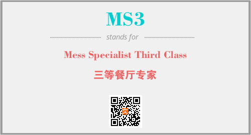 上述内容是“Mess Specialist Third Class”作为“MS3”的缩写,解释为“三等餐厅专家”时的信息,以及英文缩略词MS3所代表的英文单词,其对应的中文拼音、详细解释以及在英文中的流行度和相关分类、应用领域及应用示例等。