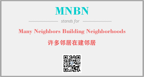 上述内容是“Many Neighbors Building Neighborhoods”作为“MNBN”的缩写,解释为“许多邻居在建邻居”时的信息,以及英文缩略词MNBN所代表的英文单词,其对应的中文拼音、详细解释以及在英文中的流行度和相关分类、应用领域及应用示例等。