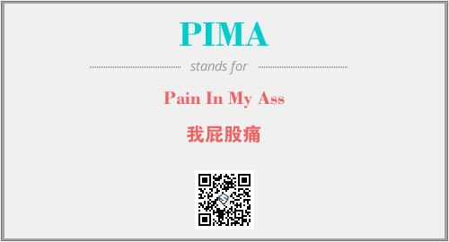 英文缩略词“PIMA”经常作为“Pain In My Ass”的英文缩写来使用,中文表示:“我屁股痛”。本文将详细介绍英文缩写词PIMA所代表英文单词,其对应的中文拼音、详细解释以及在英语中的流行度。此外,还有关于缩略词PIMA的分类、应用领域及相关应用示例等。