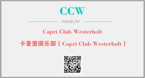 英文缩略词“CCW”经常作为“Capri Club Westerholt”的英文缩写来使用,中文表示:“卡普里俱乐部(Capri Club Westerholt)”。本文将详细介绍英文缩写词CCW所代表英文单词,其对应的中文拼音、详细解释以及在英语中的流行度。此外,还有关于缩略词CCW的分类、应用领域及相关应用示例等。