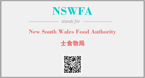 上述内容是“New South Wales Food Authority”作为“NSWFA”的缩写,解释为“士食物局”时的信息,以及英文缩略词NSWFA所代表的英文单词,其对应的中文拼音、详细解释以及在英文中的流行度和相关分类、应用领域及应用示例等。