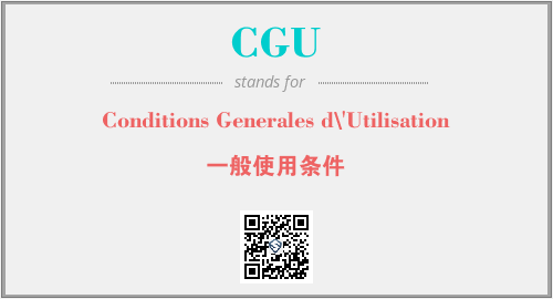 上述内容是“Conditions Generales d\'Utilisation”作为“CGU”的缩写,解释为“一般使用条件”时的信息,以及英文缩略词CGU所代表的英文单词,其对应的中文拼音、详细解释以及在英文中的流行度和相关分类、应用领域及应用示例等。