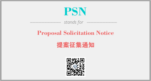 英文缩略词“PSN”经常作为“Proposal Solicitation Notice”的英文缩写来使用,中文表示:“提案征集通知”。本文将详细介绍英文缩写词PSN所代表英文单词,其对应的中文拼音、详细解释以及在英语中的流行度。此外,还有关于缩略词PSN的分类、应用领域及相关应用示例等。