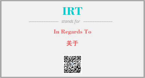 英文缩略词“IRT”经常作为“In Regards To”的英文缩写来使用,中文表示:“关于”。本文将详细介绍英文缩写词IRT所代表英文单词,其对应的中文拼音、详细解释以及在英语中的流行度。此外,还有关于缩略词IRT的分类、应用领域及相关应用示例等。