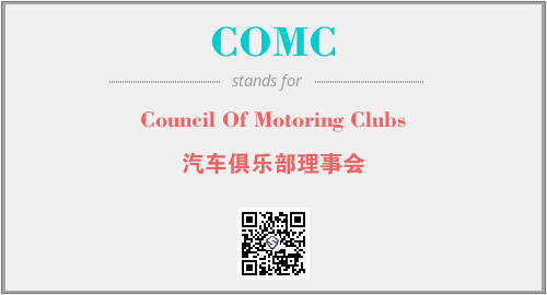 英文缩略词“COMC”经常作为“Council Of Motoring Clubs”的英文缩写来使用,中文表示:“汽车俱乐部理事会”。本文将详细介绍英文缩写词COMC所代表英文单词,其对应的中文拼音、详细解释以及在英语中的流行度。此外,还有关于缩略词COMC的分类、应用领域及相关应用示例等。