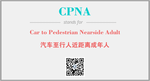上述内容是“Car to Pedestrian Nearside Adult”作为“CPNA”的缩写,解释为“汽车至行人近距离成年人”时的信息,以及英文缩略词CPNA所代表的英文单词,其对应的中文拼音、详细解释以及在英文中的流行度和相关分类、应用领域及应用示例等。