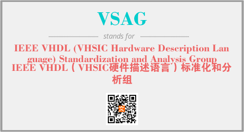 上述内容是“IEEE VHDL (VHSIC Hardware Description Language) Standardization and Analysis Group”作为“VSAG”的缩写,解释为“IEEE VHDL(VHSIC硬件描述语言)标准化和分析组”时的信息,以及英文缩略词VSAG所代表的英文单词,其对应的中文拼音、详细解释以及在英文中的流行度和相关分类、应用领域及应用示例等。