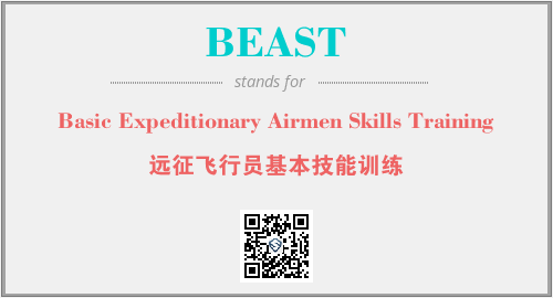 上述内容是“Basic Expeditionary Airmen Skills Training”作为“BEAST”的缩写,解释为“远征飞行员基本技能训练”时的信息,以及英文缩略词BEAST所代表的英文单词,其对应的中文拼音、详细解释以及在英文中的流行度和相关分类、应用领域及应用示例等。