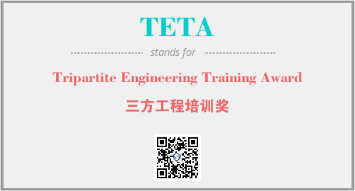 英文缩略词“TETA”经常作为“Tripartite Engineering Training Award”的英文缩写来使用,中文表示:“三方工程培训奖”。本文将详细介绍英文缩写词TETA所代表英文单词,其对应的中文拼音、详细解释以及在英语中的流行度。此外,还有关于缩略词TETA的分类、应用领域及相关应用示例等。