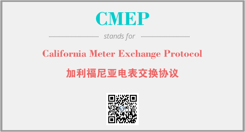 上述内容是“California Meter Exchange Protocol”作为“CMEP”的缩写,解释为“加利福尼亚电表交换协议”时的信息,以及英文缩略词CMEP所代表的英文单词,其对应的中文拼音、详细解释以及在英文中的流行度和相关分类、应用领域及应用示例等。