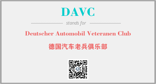 英文缩略词“DAVC”经常作为“Deutscher Automobil Veteranen Club”的英文缩写来使用,中文表示:“德国汽车老兵俱乐部”。本文将详细介绍英文缩写词DAVC所代表英文单词,其对应的中文拼音、详细解释以及在英语中的流行度。此外,还有关于缩略词DAVC的分类、应用领域及相关应用示例等。