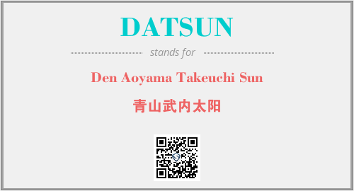 上述内容是“Den Aoyama Takeuchi Sun”作为“DATSUN”的缩写,解释为“青山武内太阳”时的信息,以及英文缩略词DATSUN所代表的英文单词,其对应的中文拼音、详细解释以及在英文中的流行度和相关分类、应用领域及应用示例等。