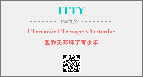 英文缩略词“ITTY”经常作为“I Terrorized Teenagers Yesterday”的英文缩写来使用,中文表示:“我昨天吓坏了青少年”。本文将详细介绍英文缩写词ITTY所代表英文单词,其对应的中文拼音、详细解释以及在英语中的流行度。此外,还有关于缩略词ITTY的分类、应用领域及相关应用示例等。